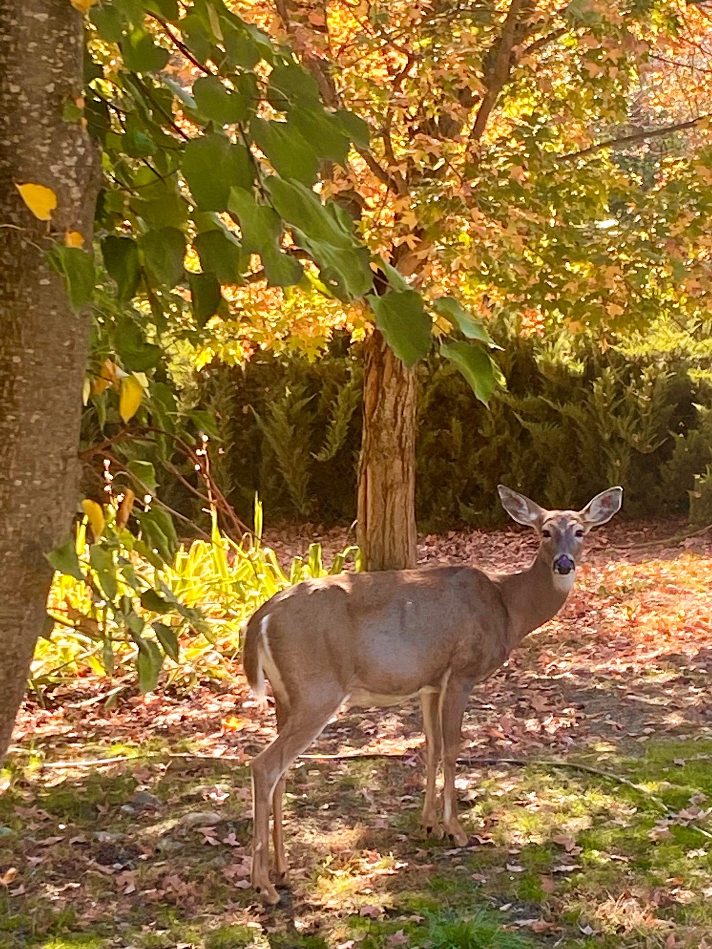 When I need to think, I like to go to a small deck on the south end of our property. I like to call it my “mini sanctuary” and I do a whole lot of processing, thinking, meditating and praying there (it gets a little rough in the wintertime). It’s a peaceful place with lots of trees and bushes and the local wildlife wanders through on a regular basis. My hubby gave me a couple of really nice chairs, a small table and a deck fountain to make it extra special. When he can’t find me in the house, he knows where to look. So on this less-than-riveting day, I took an unintentional break and headed out to the mini sanctuary. This deer friend meets me there often.